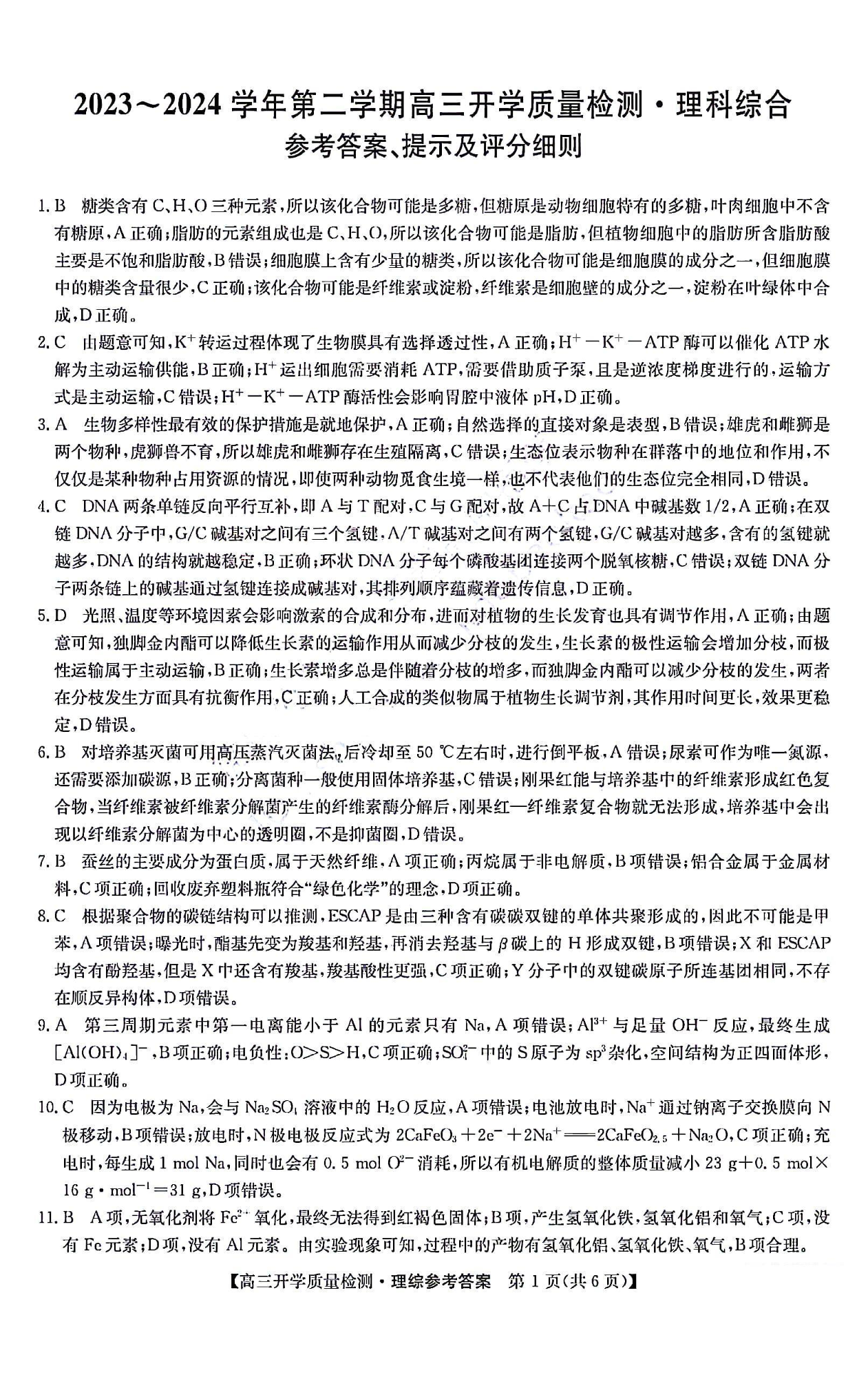 2024山西卓越联盟高三开学质量检测(243577Z)理综答案