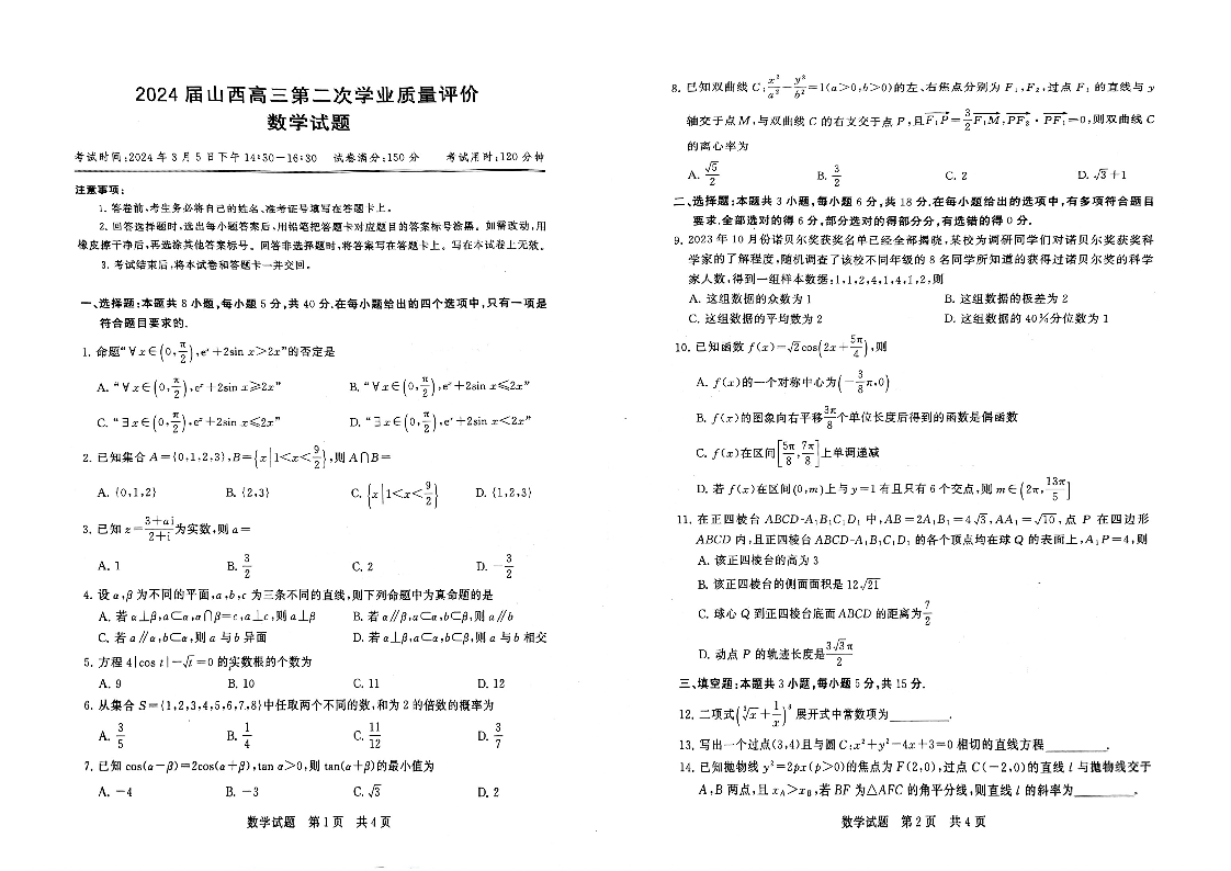 山西省2024届高三第二次学业质量评估数学+答案