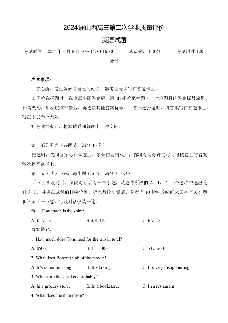 山西省2024届高三第二次学业质量评估英语