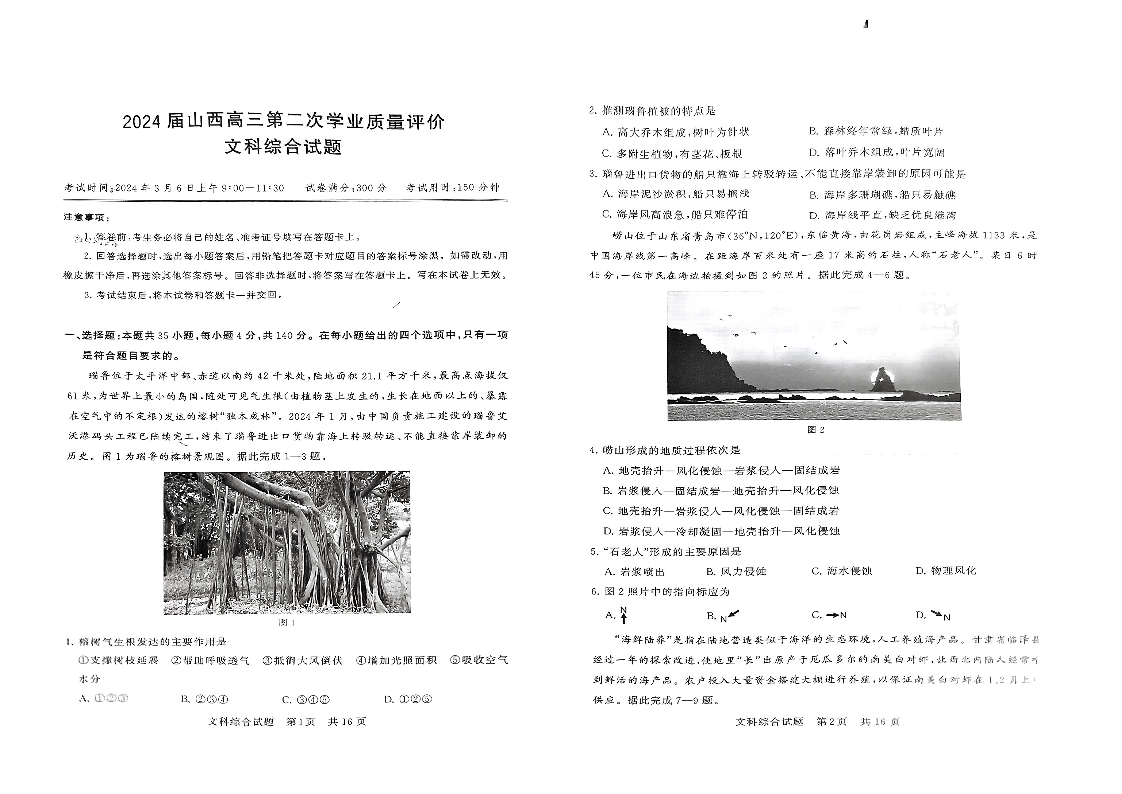 山西省2024届高三第二次学业质量评估文科综合