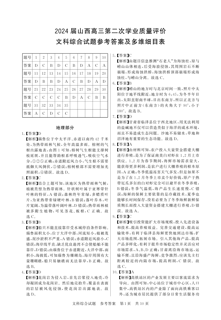 山西省2024届高三第二次学业质量评估文科综合答案