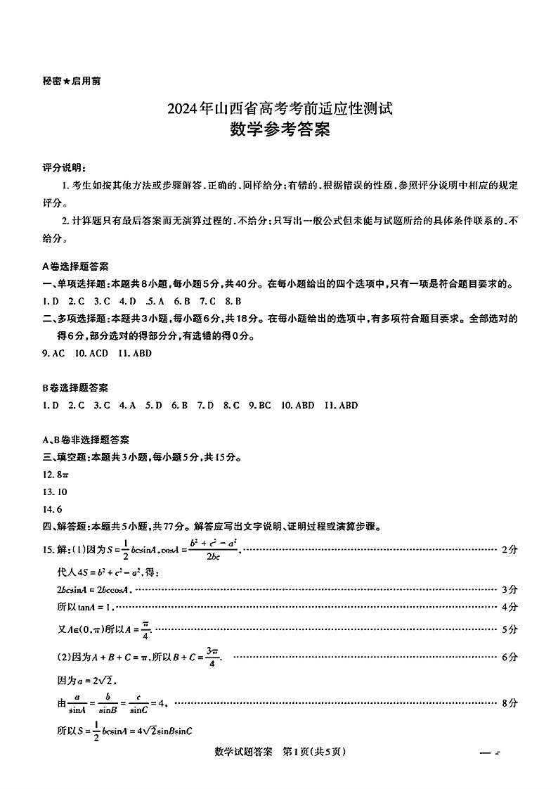 山西省2024届高三适应性考试(一)数学答案