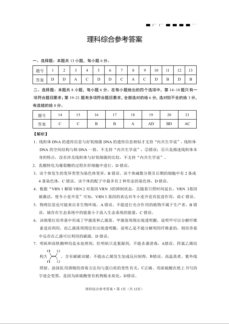 云南师范大学附属中学2024届高三下学期高考适应性月考卷(八)理综答案