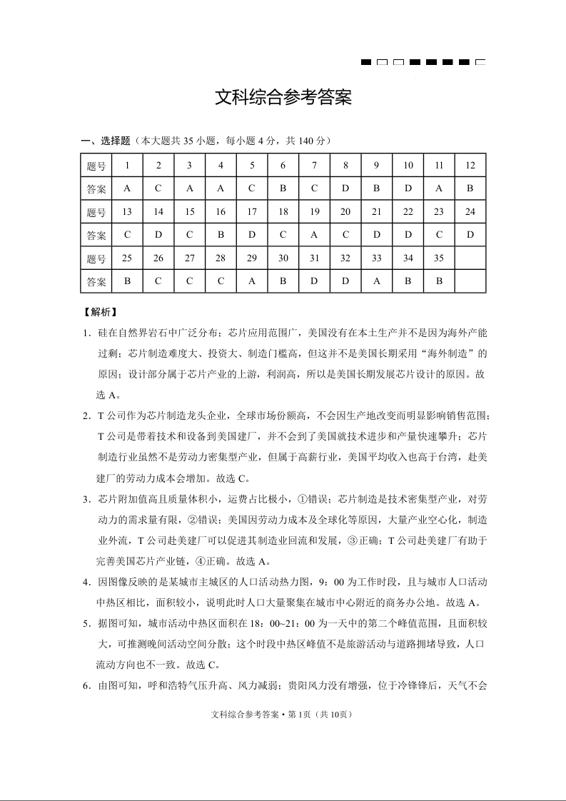 云南师范大学附属中学2024届高三下学期高考适应性月考卷(八)文综答案