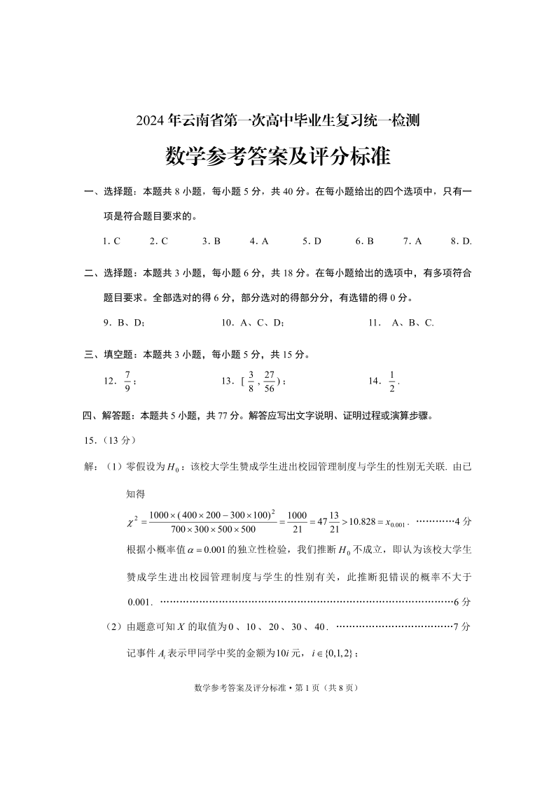 云南省2024年第一次高中毕业生复习统一检测数学答案