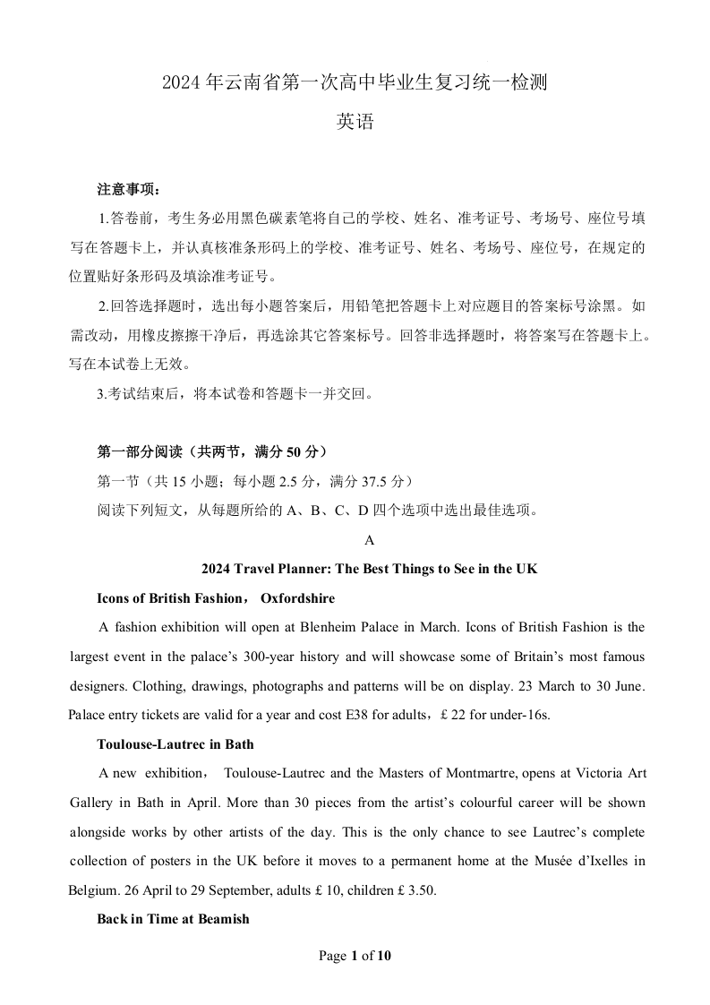 云南省2024年第一次高中毕业生复习统一检测英语