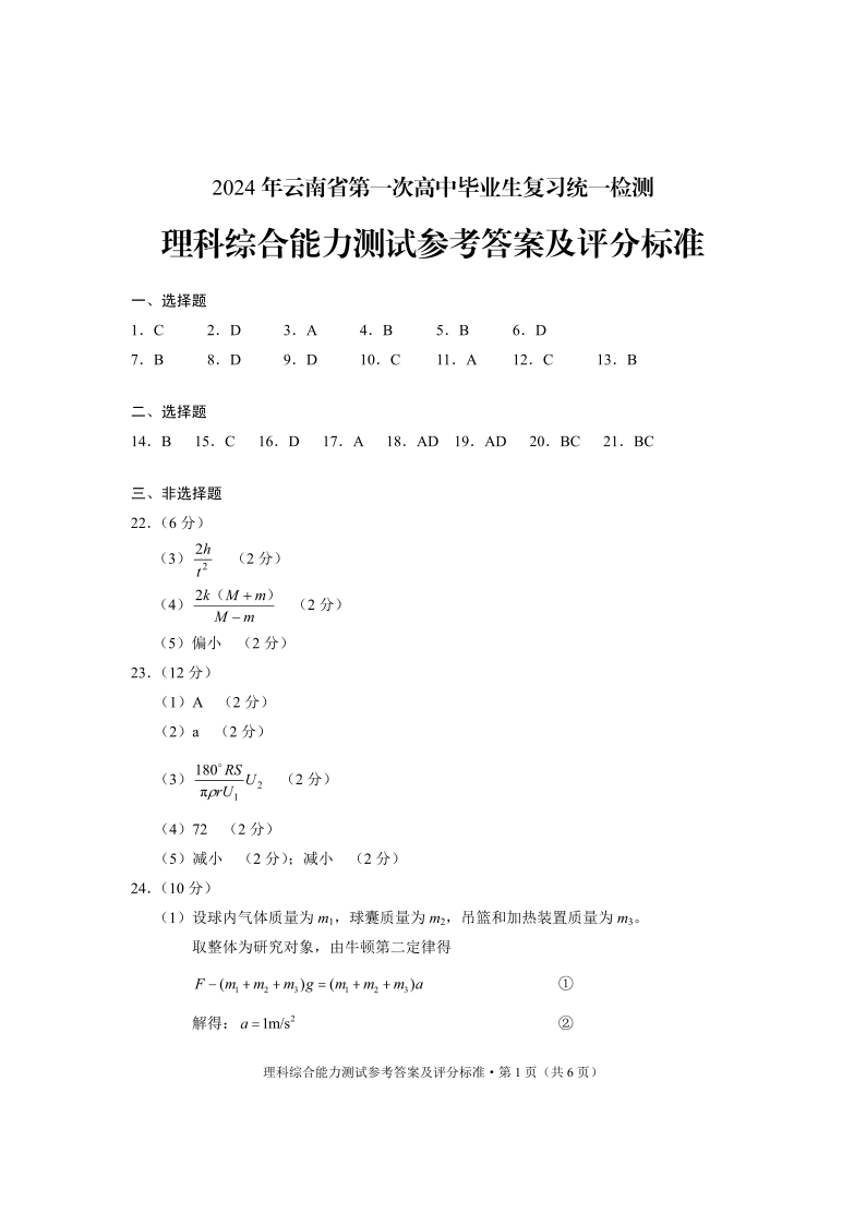 云南省2024年第一次高中毕业生复习统一检测理综答案
