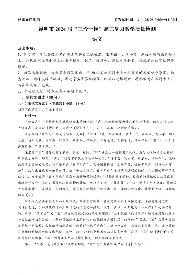 2024届云南省昆明市高三下学期“三诊一模”教学质量检测(二模)语文+答案