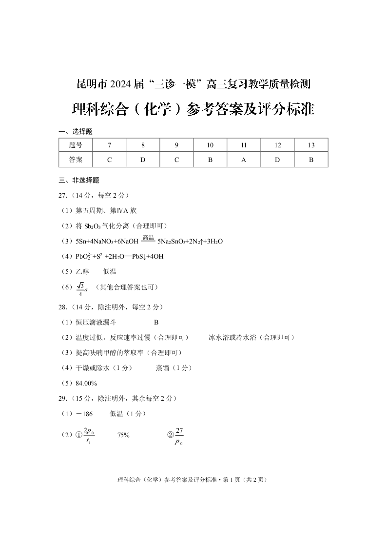 云南省昆明市2024届高三下学期“三诊一模”教学质量检测(二模)化学答案