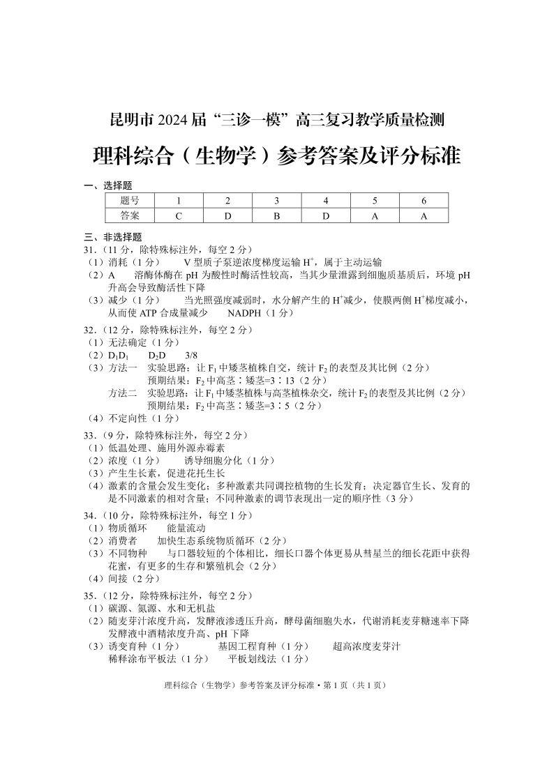 云南省昆明市2024届高三下学期“三诊一模”教学质量检测(二模)生物学答案
