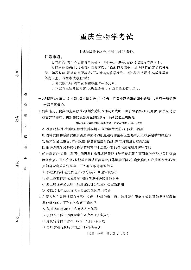 重庆市好教育联盟2024-2025学年下学期5月高三联考生物