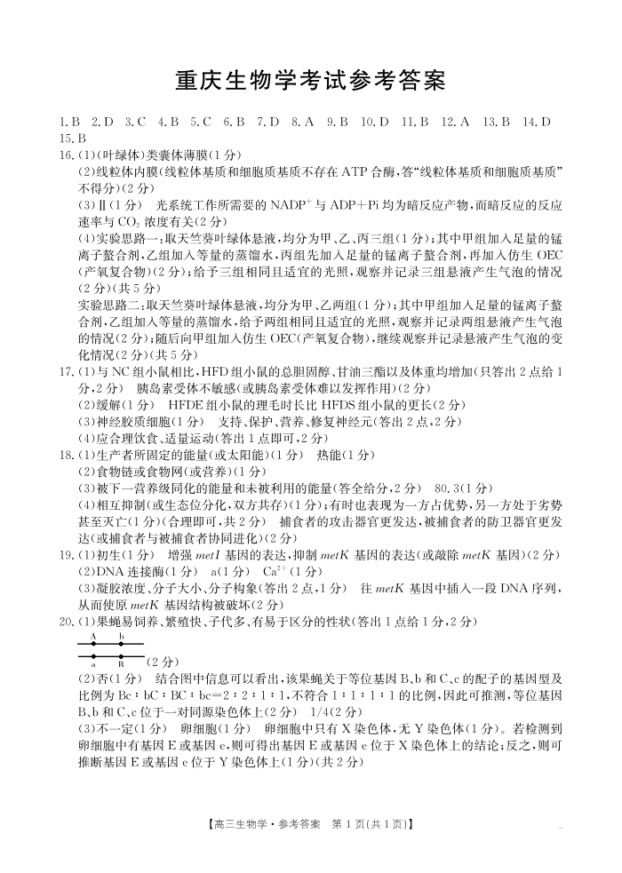 重庆市好教育联盟2024-2025学年下学期5月高三联考生物答案