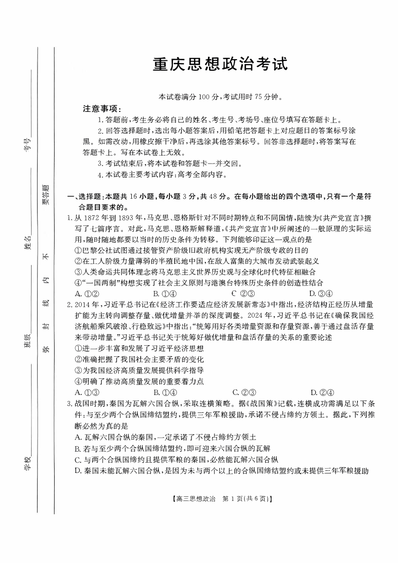 重庆市好教育联盟2024-2025学年下学期5月高三联考政治