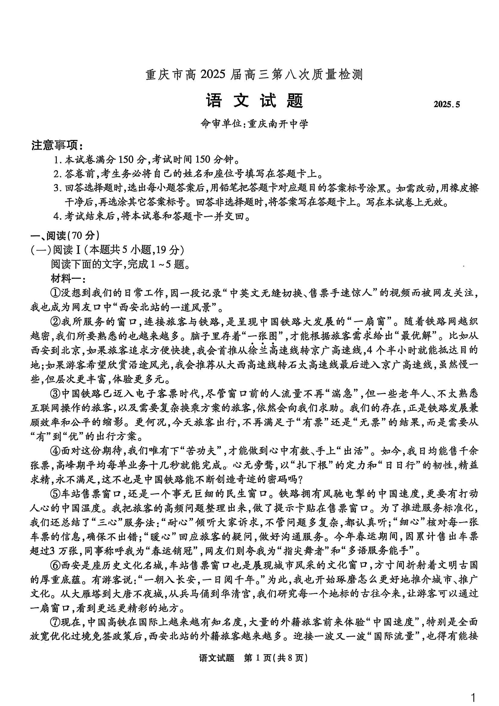 重庆市南开中学2024-2025学年下学期高三第八次质量检测语文