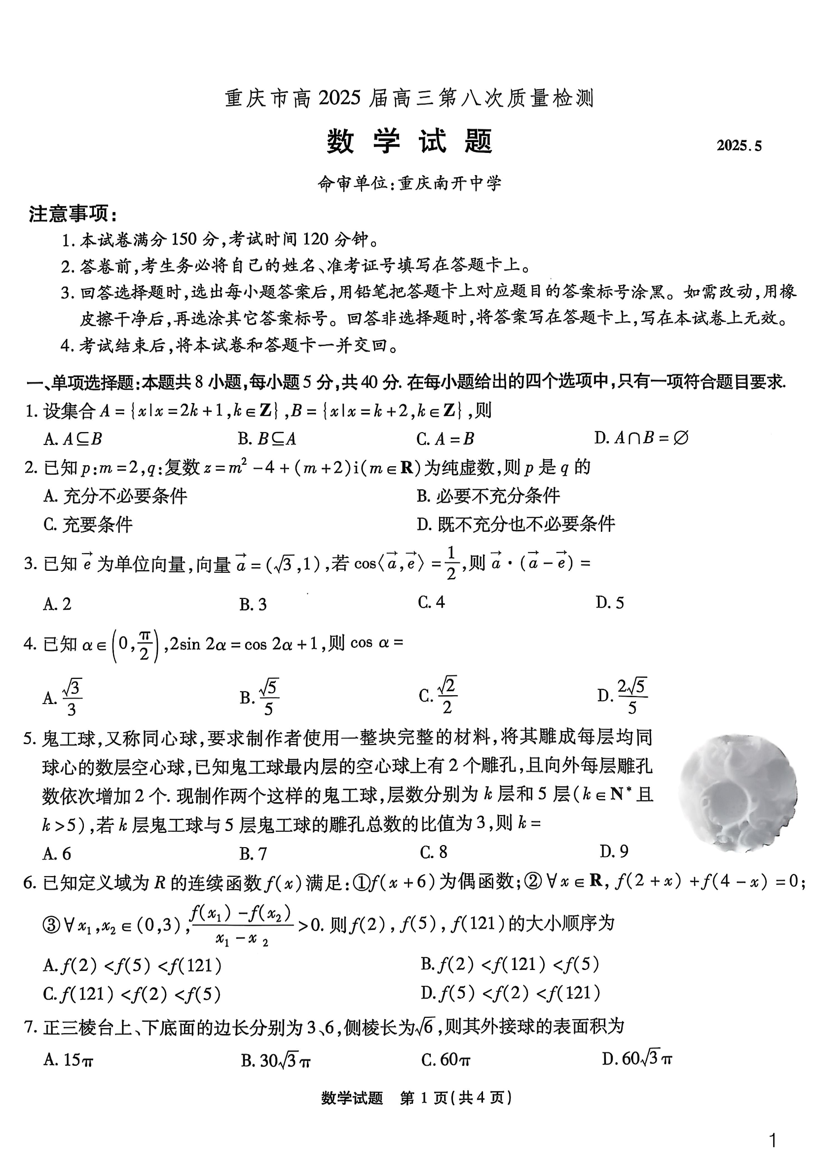 重庆市南开中学2024-2025学年下学期高三第八次质量检测数学