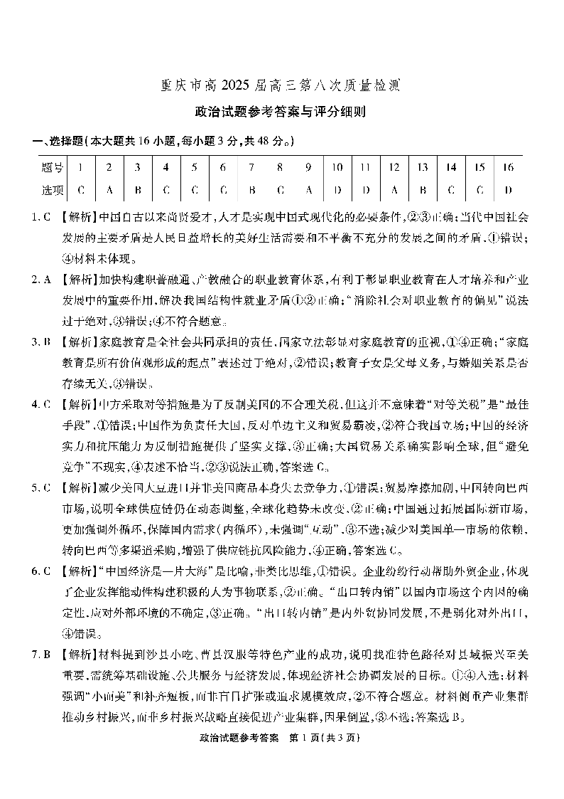 重庆市南开中学2024-2025学年下学期高三第八次质量检测政治答案