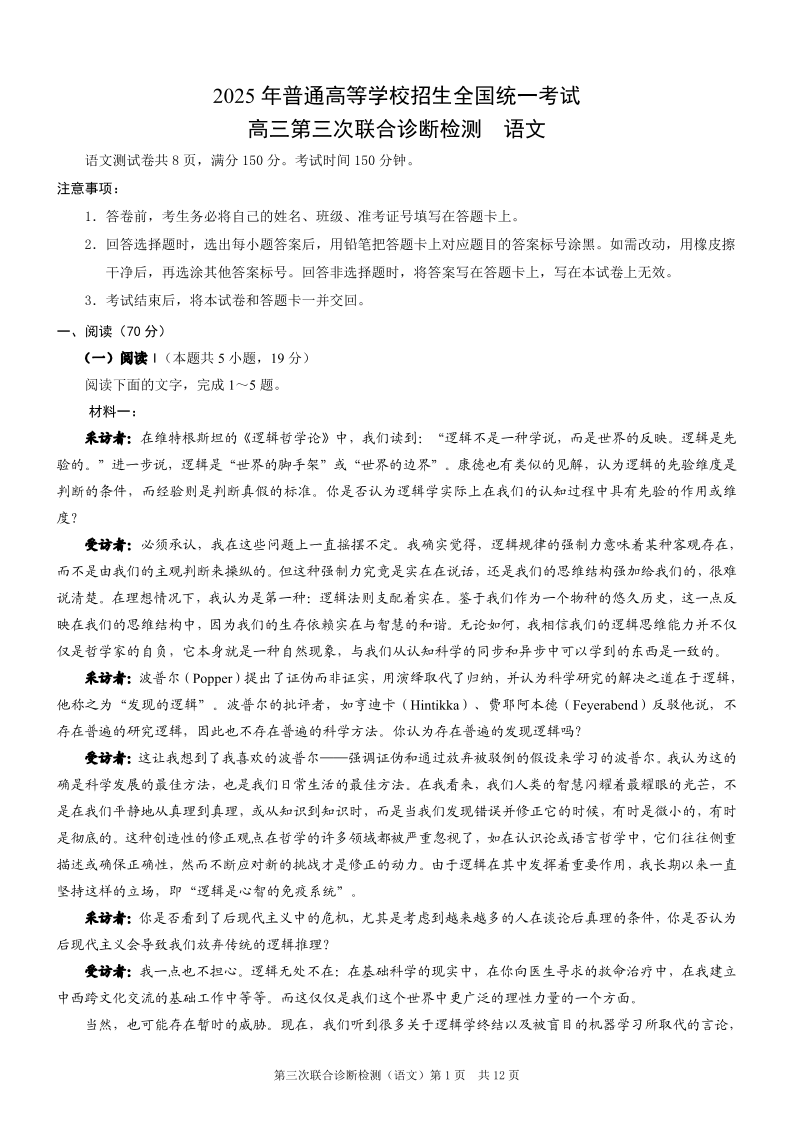重庆市2025年普通高等学校招生全国统一考试高三第三次联合诊断检测语文