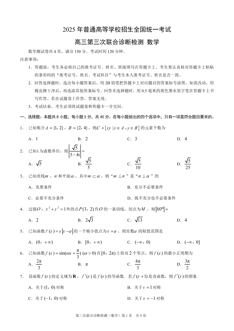 重庆市2025年普通高等学校招生全国统一考试高三第三次联合诊断检测数学