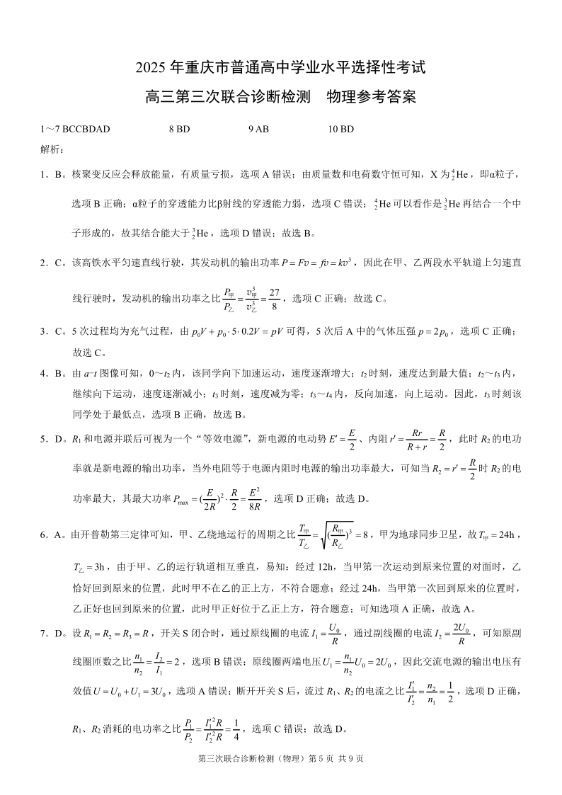 重庆市2025年普通高等学校招生全国统一考试高三第三次联合诊断检测物理答案