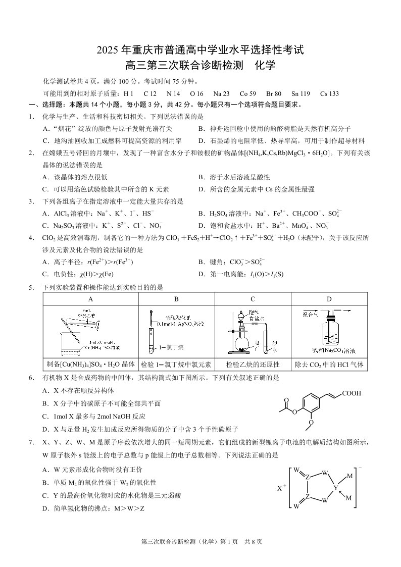 重庆市2025年普通高等学校招生全国统一考试高三第三次联合诊断检测化学