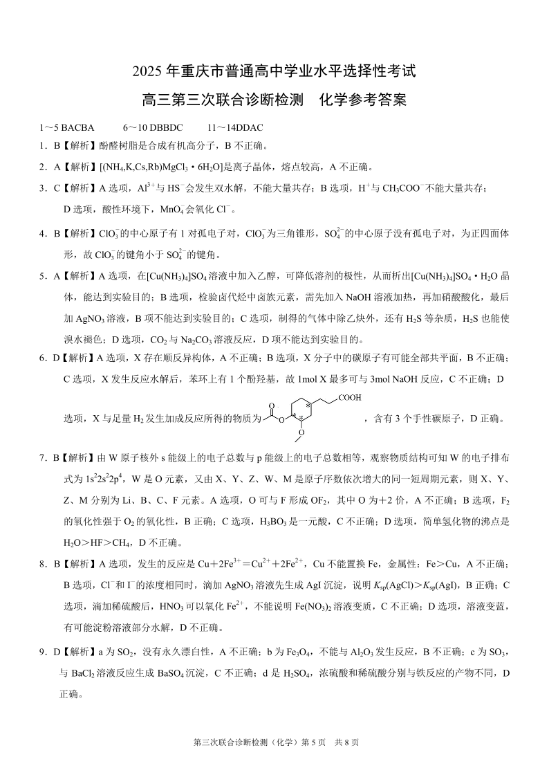 重庆市2025年普通高等学校招生全国统一考试高三第三次联合诊断检测化学答案