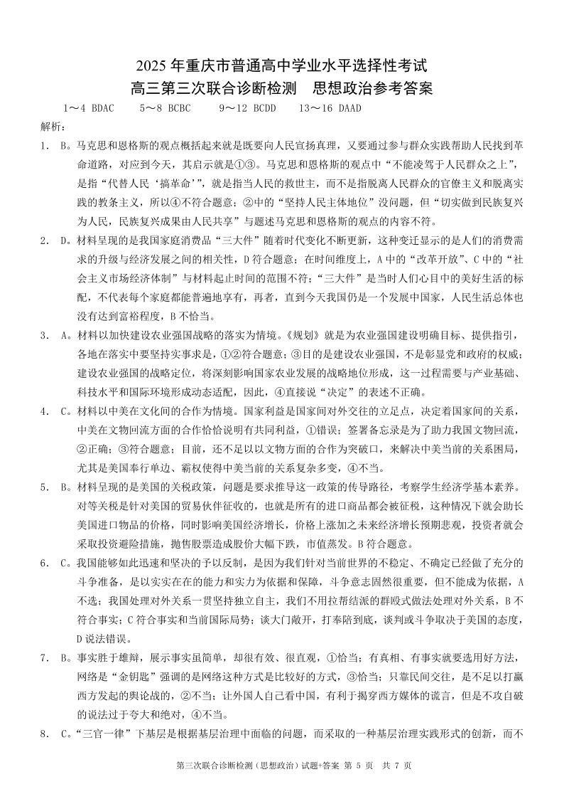 重庆市2025年普通高等学校招生全国统一考试高三第三次联合诊断检测政治答案
