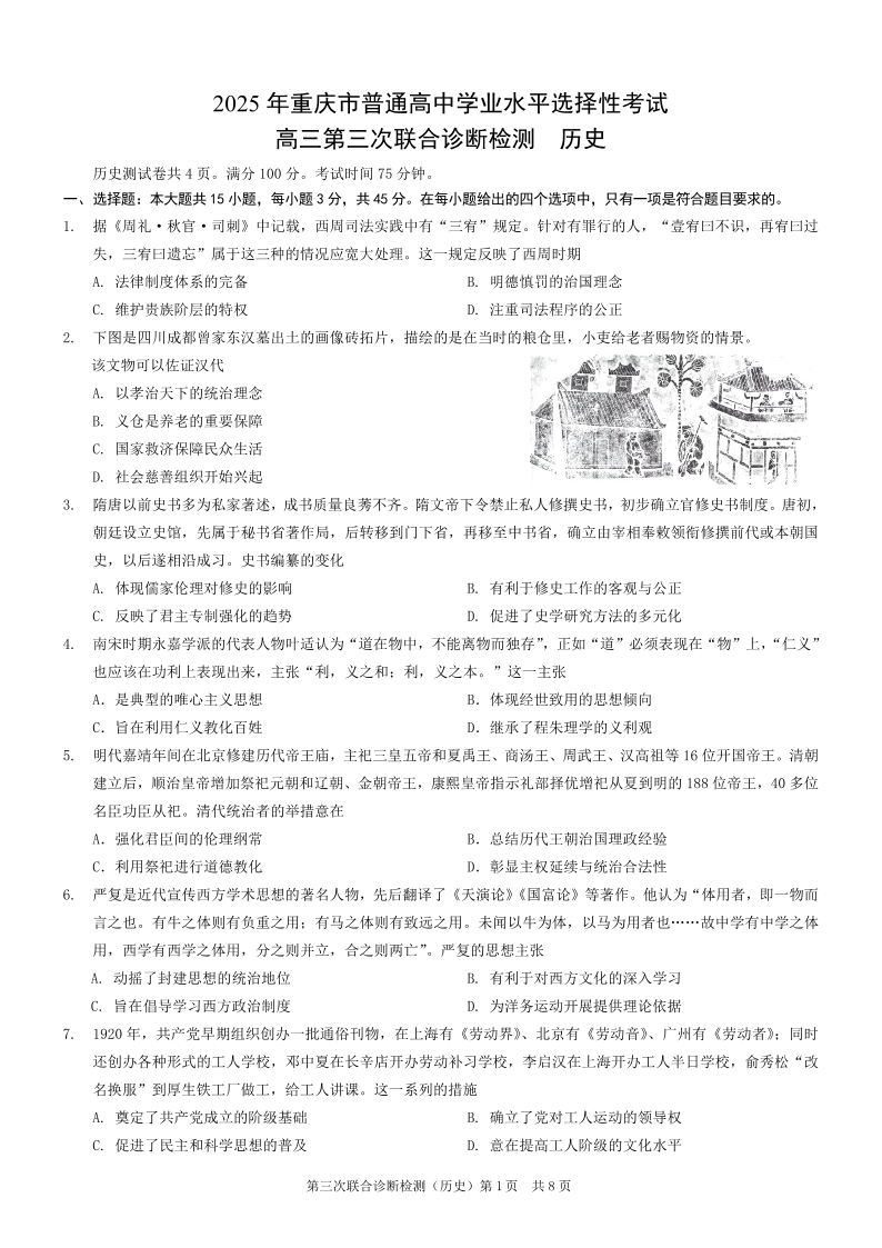 重庆市2025年普通高等学校招生全国统一考试高三第三次联合诊断检测历史
