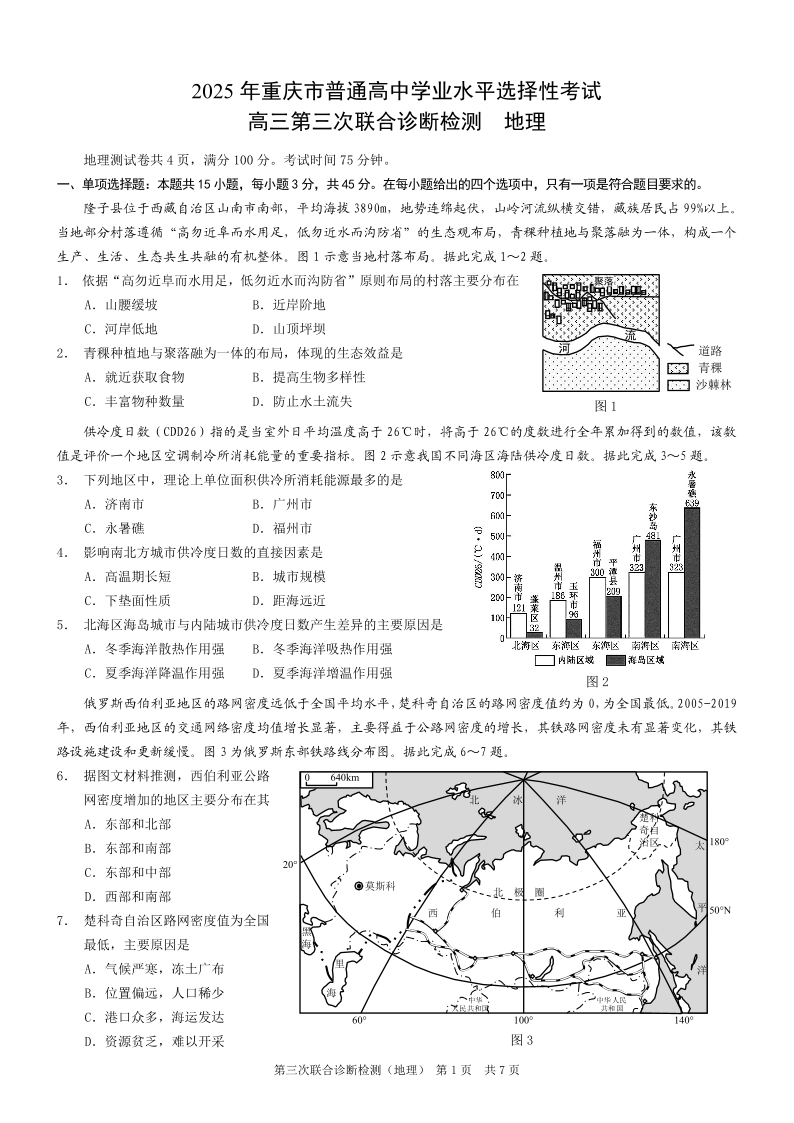 重庆市2025年普通高等学校招生全国统一考试高三第三次联合诊断检测地理