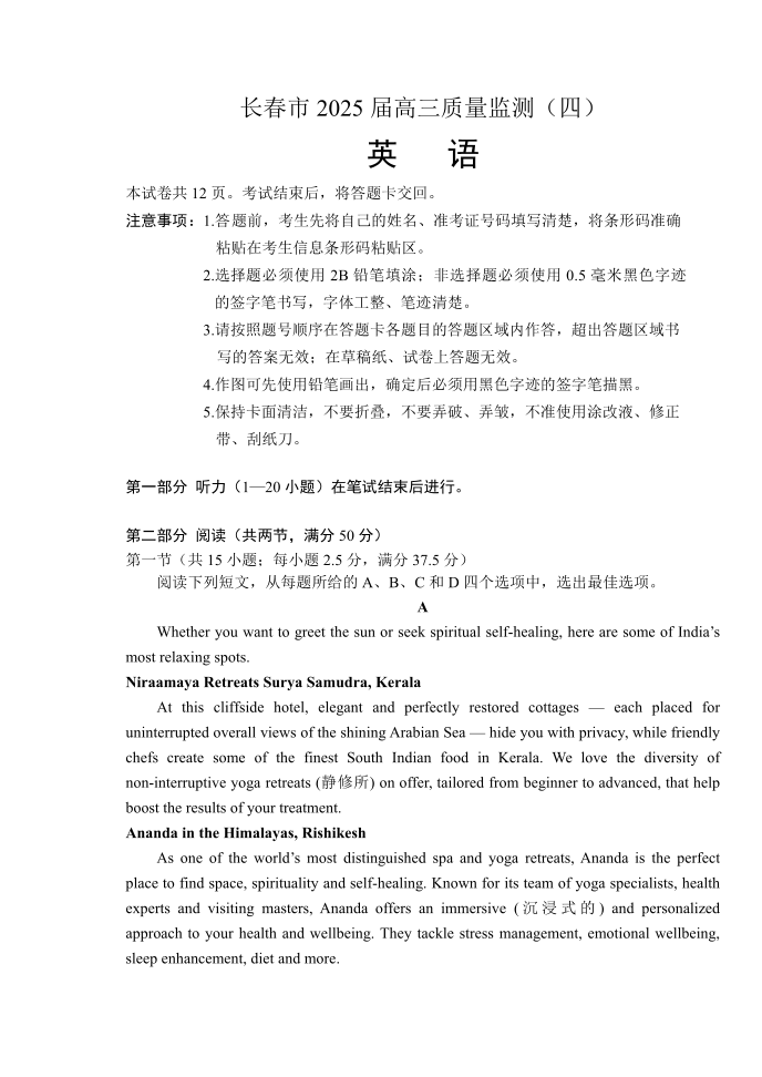 吉林省长春市2024-2025学年下学期高三第四次模拟监测英语