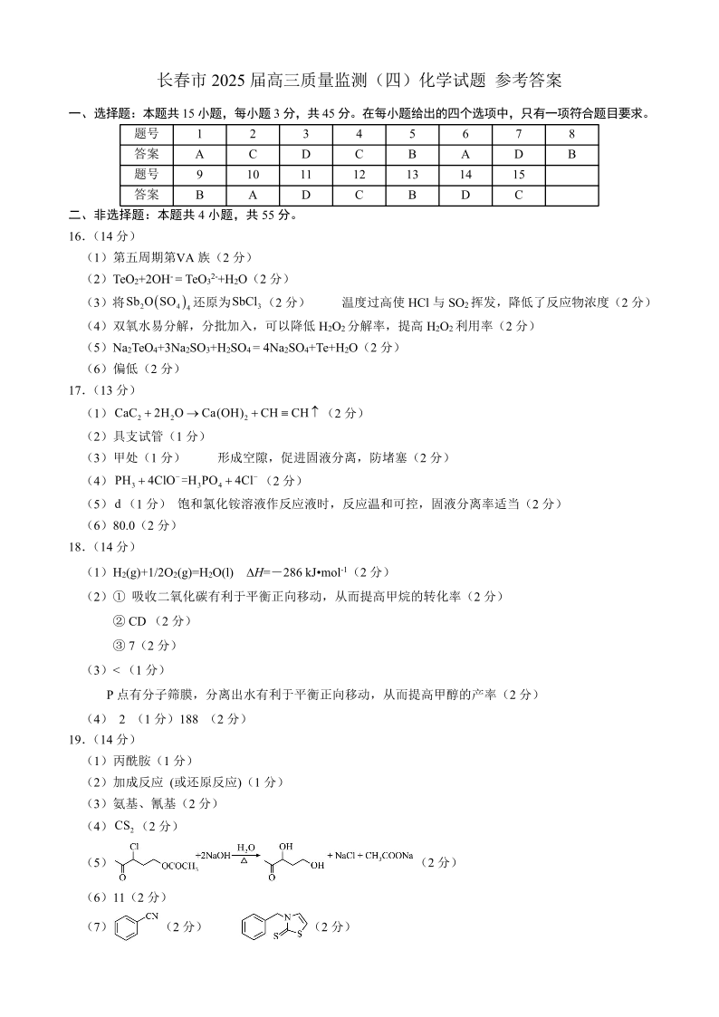 吉林省长春市2024-2025学年下学期高三第四次模拟监测化学答案