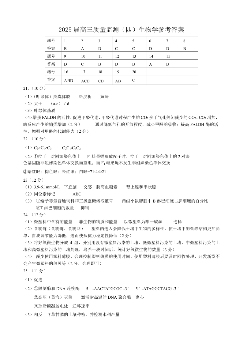 吉林省长春市2024-2025学年下学期高三第四次模拟监测生物答案