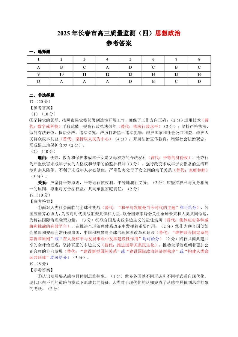 吉林省长春市2024-2025学年下学期高三第四次模拟监测政治答案