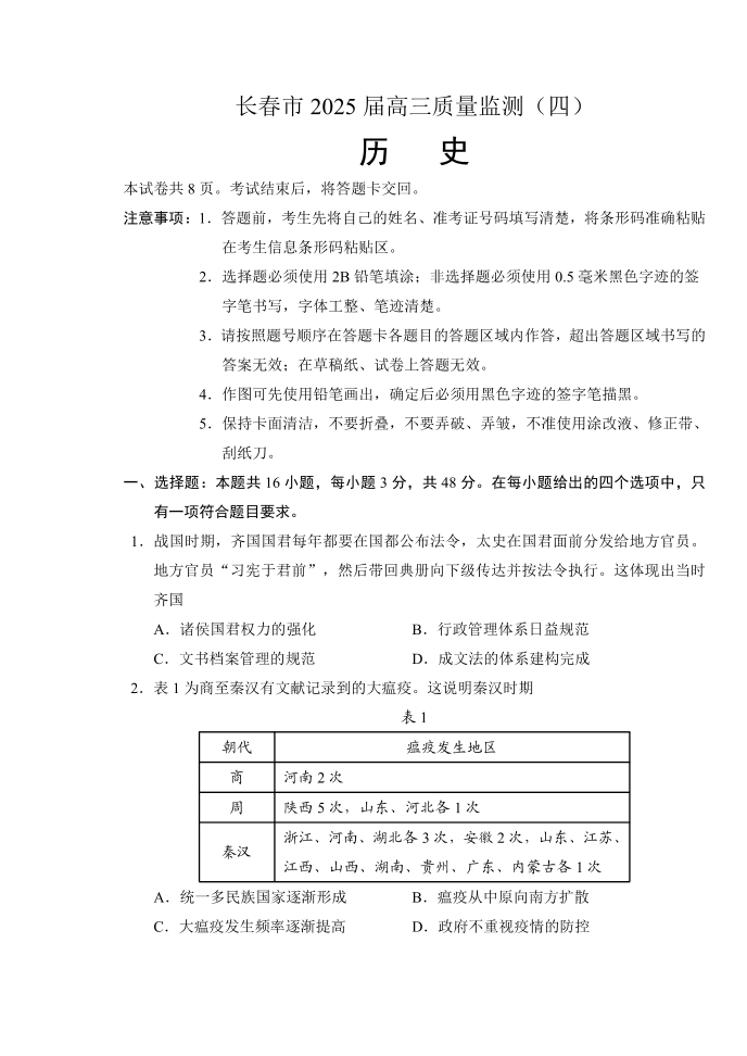 吉林省长春市2024-2025学年下学期高三第四次模拟监测历史