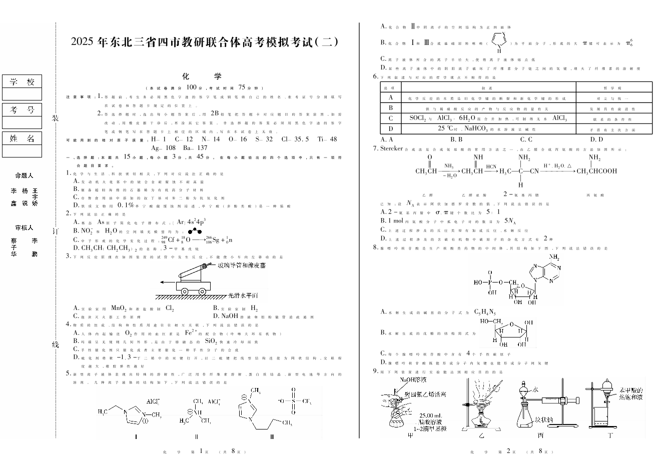 东北三省四市教研联合体2024-2025学年高三高考模拟考试(二)化学