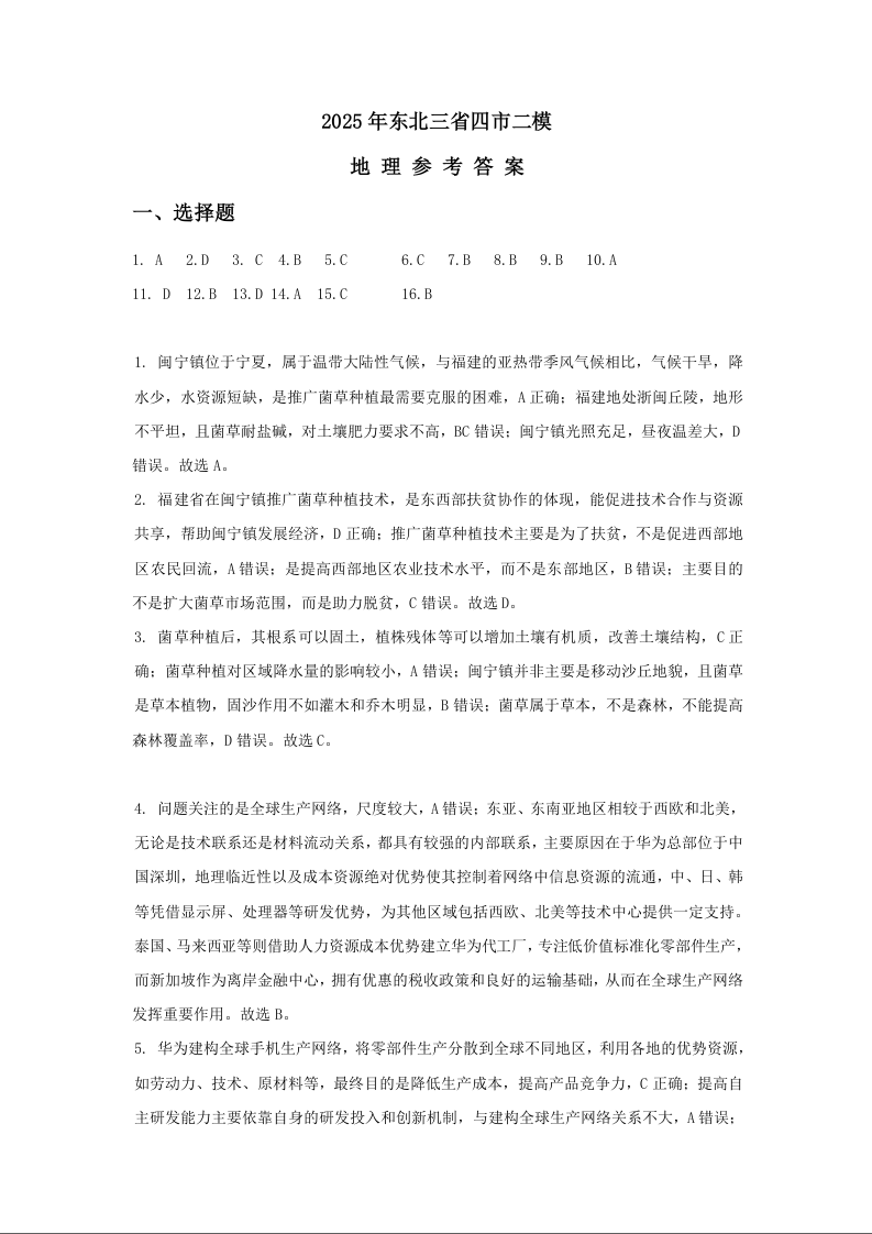 东北三省四市教研联合体2024-2025学年高三高考模拟考试(二)地理答案