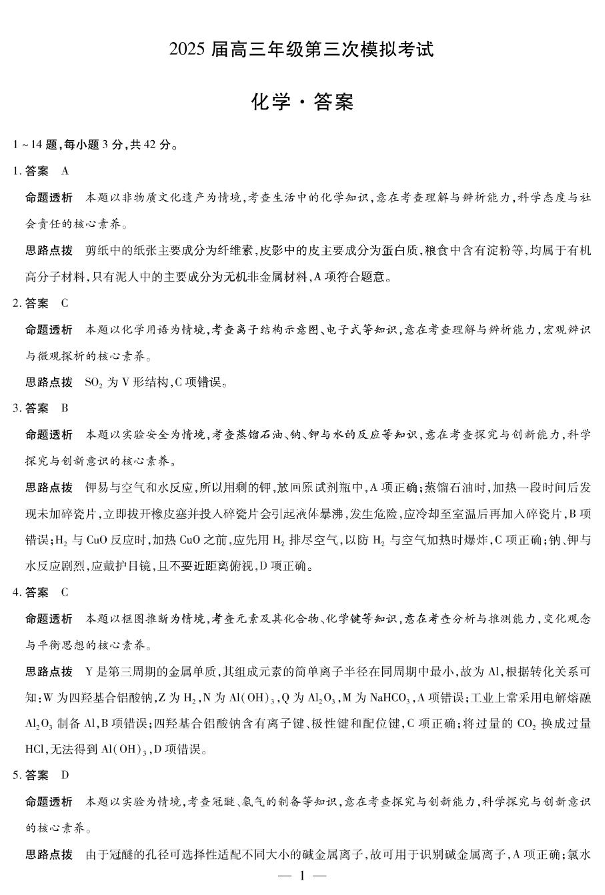 河南省许平洛济四市2024-2025学年下学期高三三模质量检测化学答案