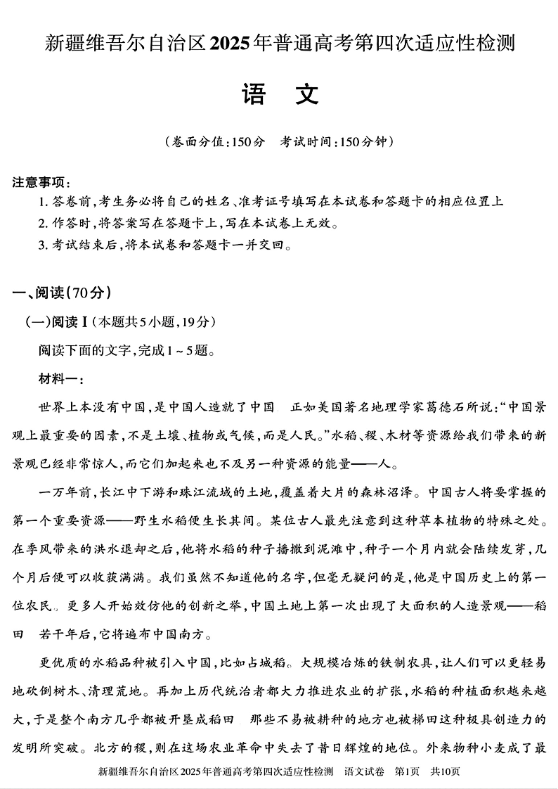 新疆维吾尔自治区2024-2025学年高三高考第四次适应性检测语文+答案