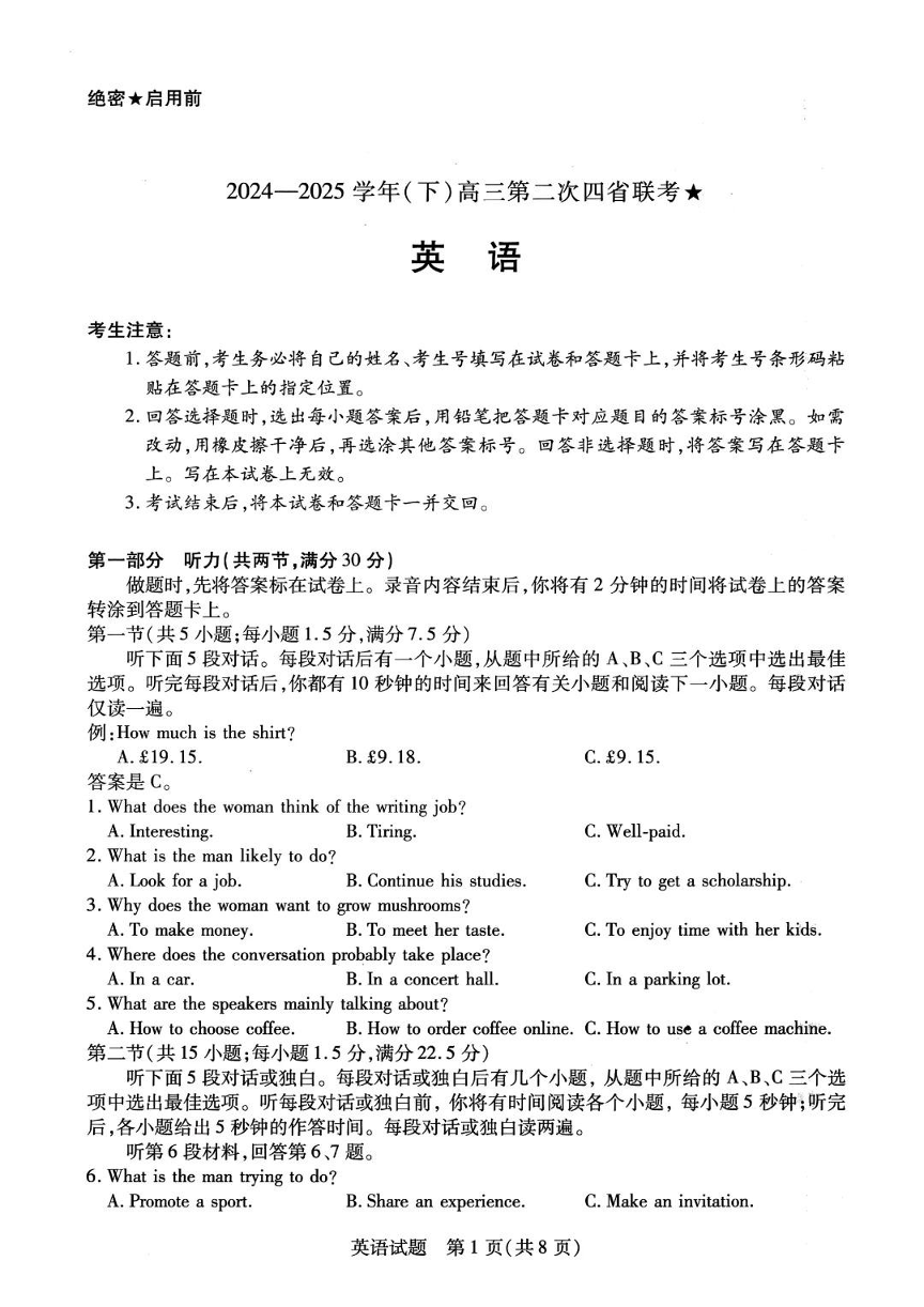 西北省份区域高中2024-2025学年下学期高三第二次联考英语+答案