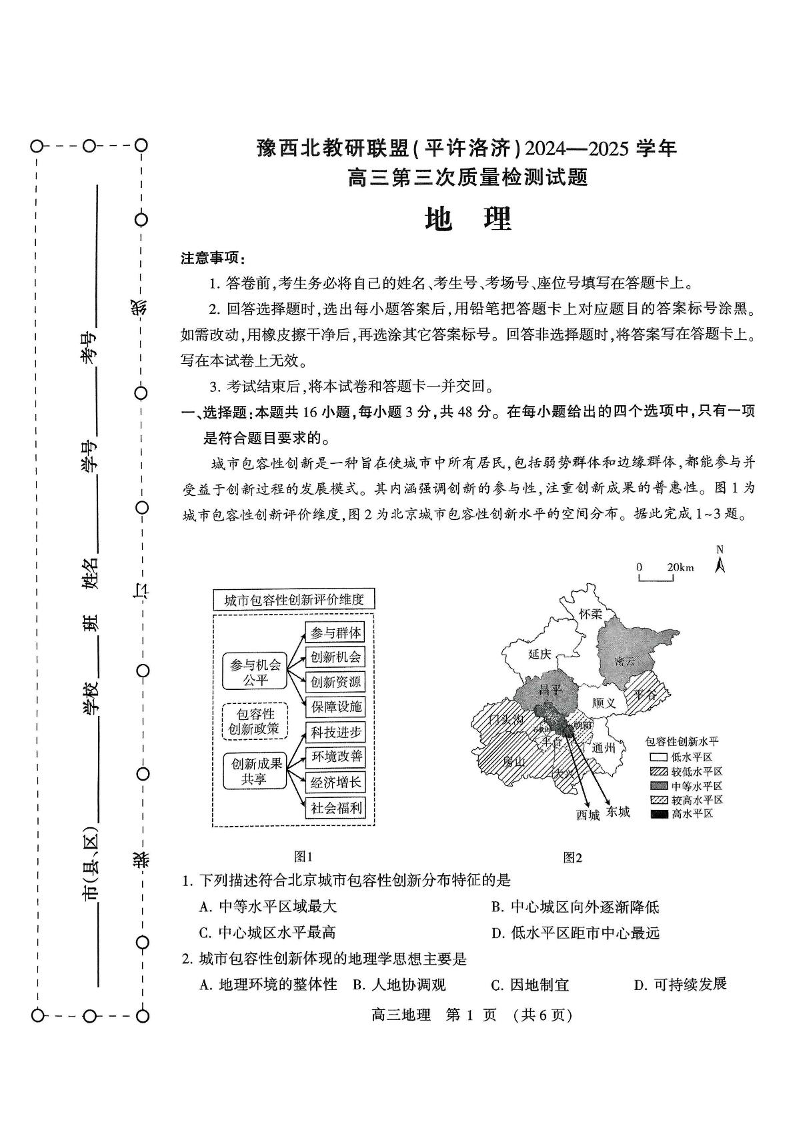河南省许平洛济四市2024-2025学年下学期高三三模质量检测地理+答案