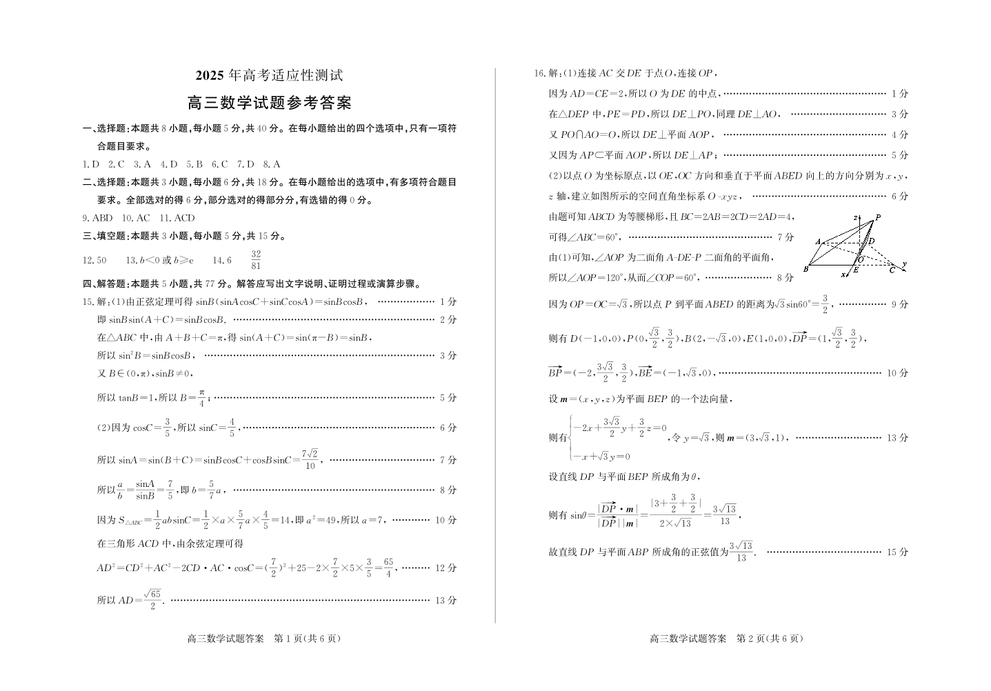 山东省烟台市2024-2025学年下学期5月高三二模测试数学答案