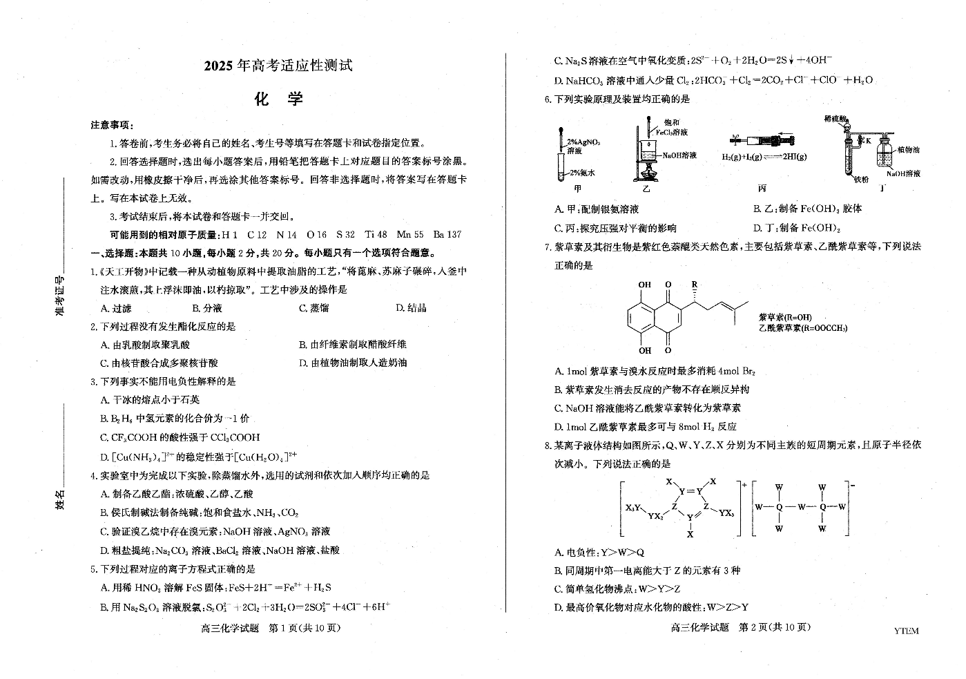 山东省烟台市2024-2025学年下学期5月高三二模测试化学