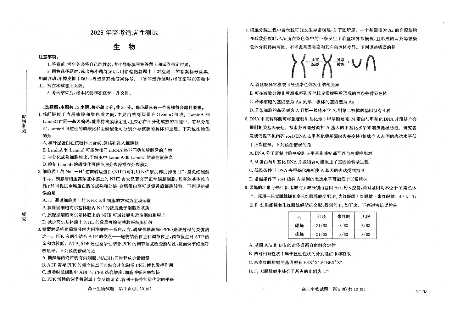 山东省烟台市2024-2025学年下学期5月高三二模测试生物