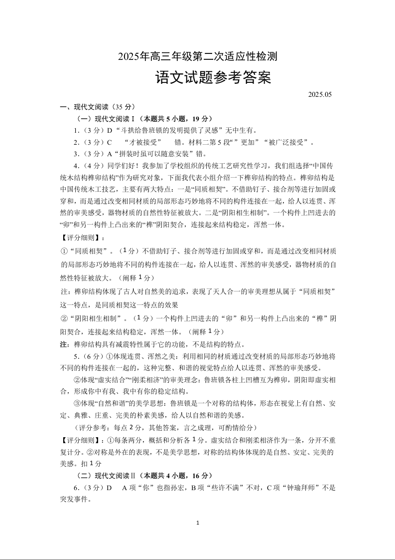 山东省青岛市2024-2025学年下学期5月高三二模检测语文答案详