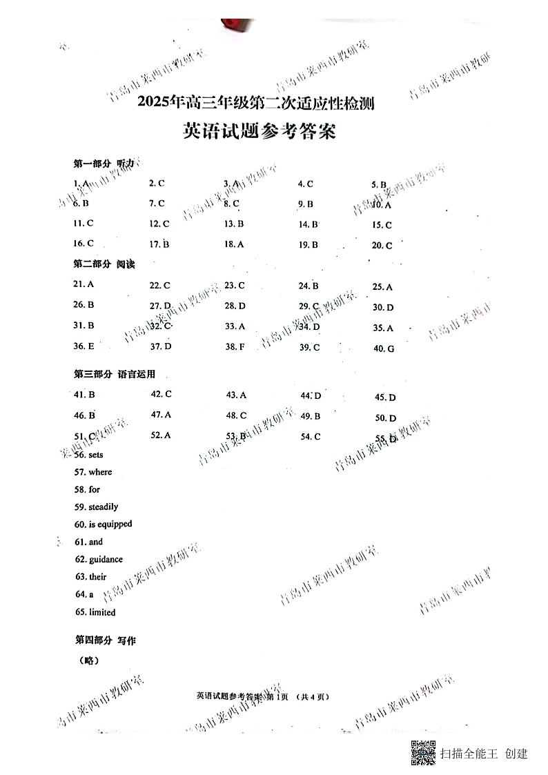 山东省青岛市2024-2025学年下学期5月高三二模检测英语答案