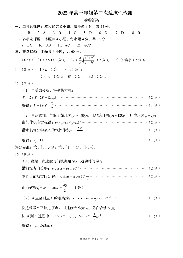 山东省青岛市2024-2025学年下学期5月高三二模检测物理答案