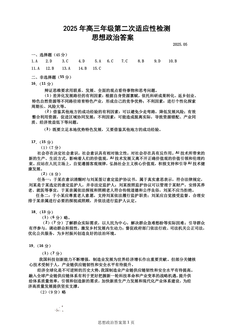 山东省青岛市2024-2025学年下学期5月高三二模检测政治答案