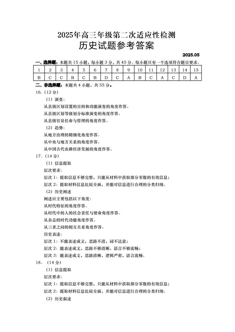 山东省青岛市2024-2025学年下学期5月高三二模检测历史答案