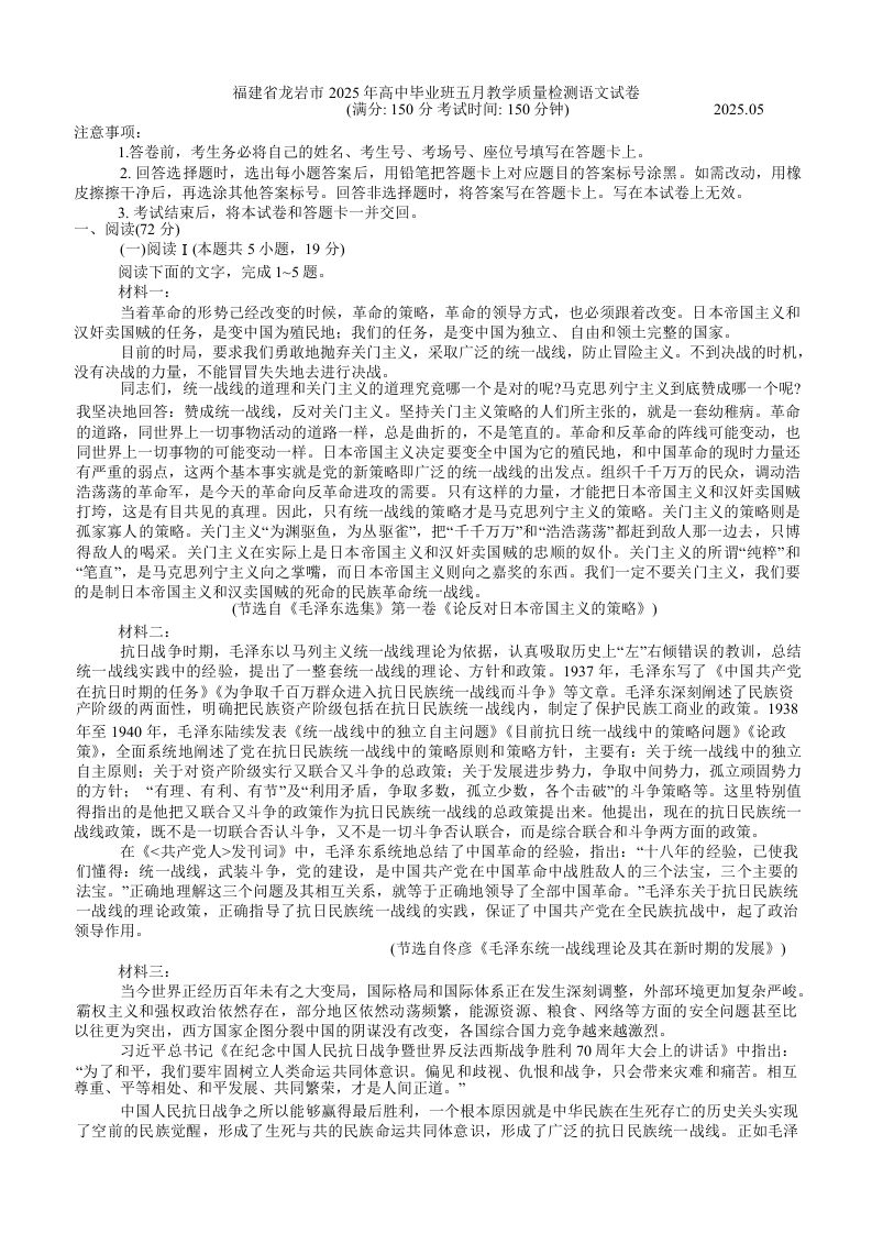 福建省龙岩市2024-2025学年下学期五月高三教学质量检测语文+答案