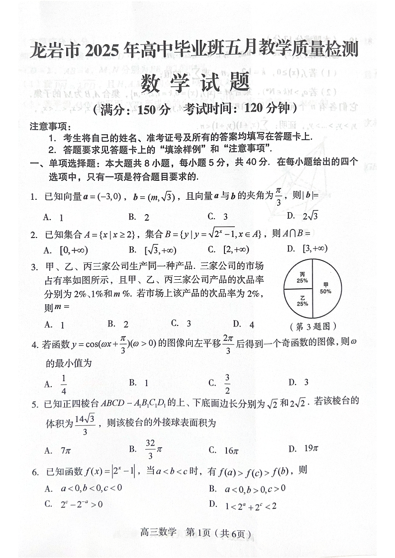 福建省龙岩市2024-2025学年下学期五月高三教学质量检测数学