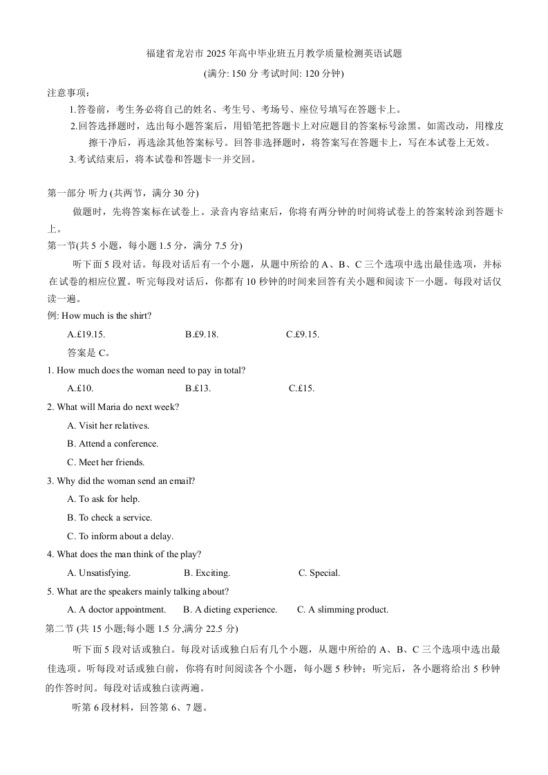 福建省龙岩市2024-2025学年下学期五月高三教学质量检测英语+答案